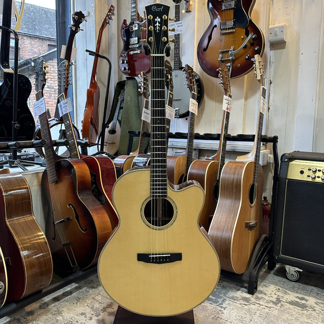 The Cort Custom Shop CJ is a premium acoustic guitar from Cort’s higher-end custom shop range, built around the company’s popular CJ body style, which is similar in size and feel to a jumbo or grand jumbo. It’s designed to deliver a big, open sound with strong volume and projection, making it especially suited to strumming, accompaniment, and live performance, while still offering enough balance for more detailed playing. These models typically feature upgraded tonewoods, higher-grade finishing, and more refined appointments than standard Cort acoustics, giving them a more “boutique” look and feel. Overall, the Cort Custom Shop CJ is valued as a professional-level acoustic that aims to provide custom-level build quality and powerful tone at a price that often undercuts many comparable high-end brands.