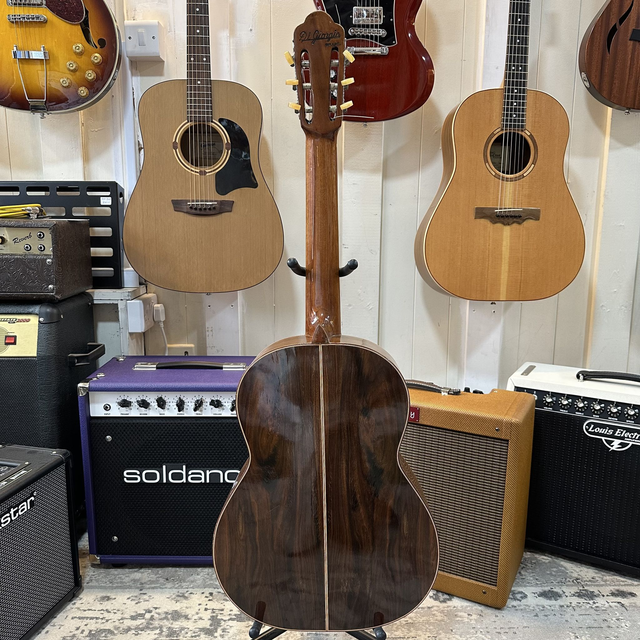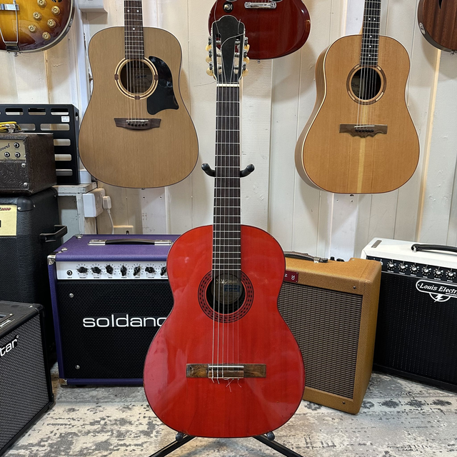 The Di Giorgio 1972 Brazilian Bossa Nova guitar is a vintage nylon-string acoustic crafted to deliver the smooth, warm tones ideal for bossa nova and other Brazilian styles. Made in Brazil by the renowned Di Giorgio company, it features a solid spruce top with laminated rosewood back and sides, producing a rich, balanced sound with clear trebles and mellow bass. Its slightly smaller body and low action make it particularly comfortable for fingerstyle playing, while the traditional Brazilian craftsmanship ensures a responsive, expressive instrument that captures the rhythmic subtleties and melodic nuance of classic bossa nova music.