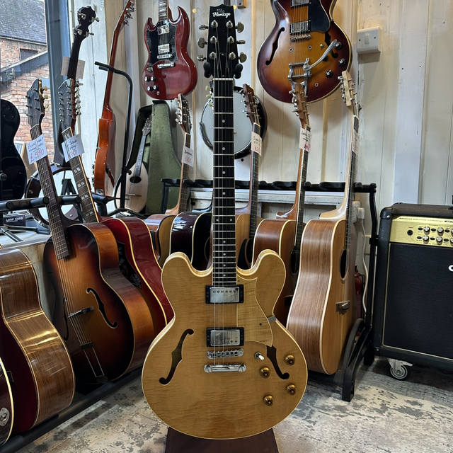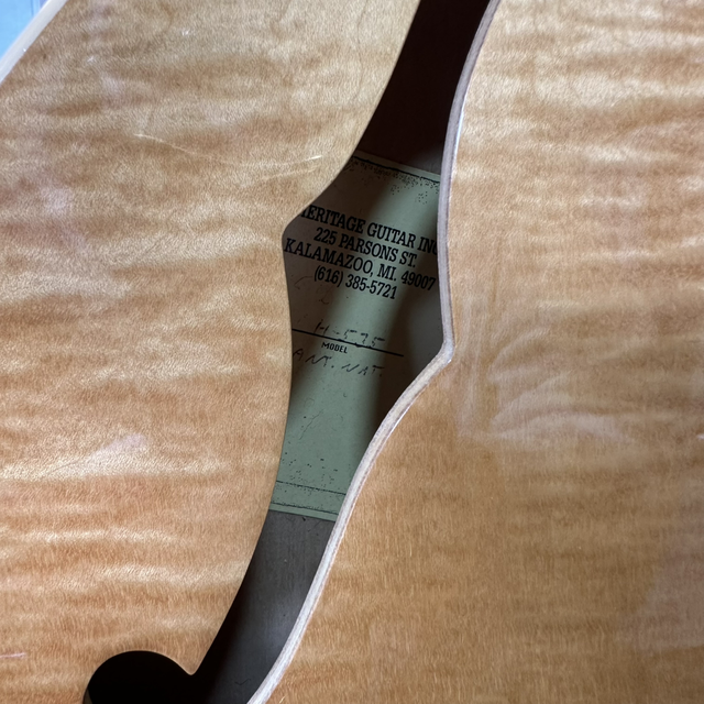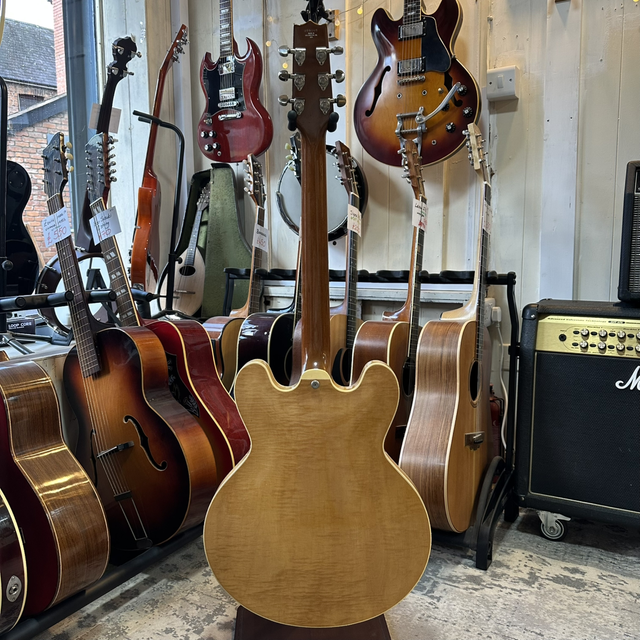 The Heritage H-535 is a semi-hollow, double-cutaway electric guitar closely based on the classic ES-335 style. It’s hand-built in Kalamazoo, Michigan, in the original Gibson factory, and is widely respected for its high-quality craftsmanship and vintage feel. The guitar uses a laminated maple body with a solid centre block, which gives it a warm, resonant semi-hollow character while keeping feedback under control and adding sustain. It typically comes with a mahogany neck and rosewood fingerboard, plus two humbucking pickups (often Seymour Duncans), making it a very versatile instrument that can comfortably handle blues, jazz, rock, and soul.