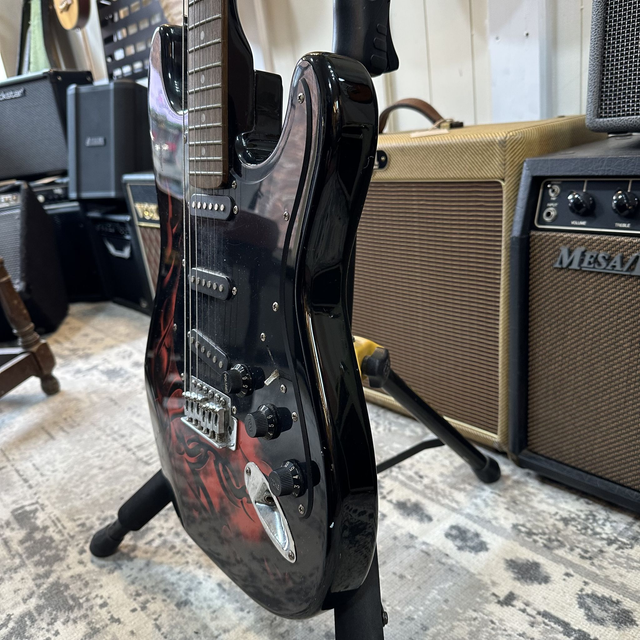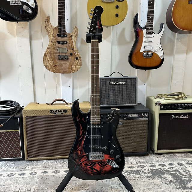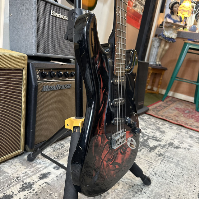 Jaxville Demon Strat style. Flame/tribal effect paintwork in red and black.