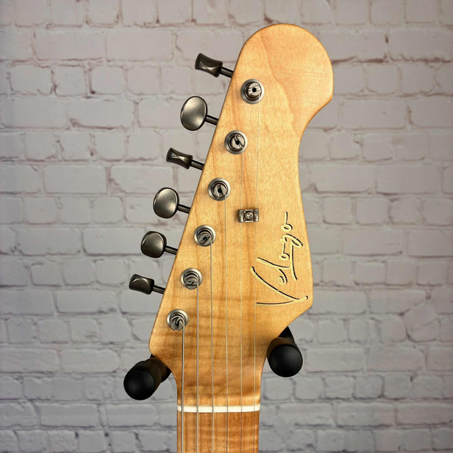 This is a completely handmade custom guitar. The body is crafted from lightweight swamp ash, offering excellent resonance and balance, paired with a flamed maple neck with a slightly chunky, comfortable profile that feels substantial without being cumbersome.