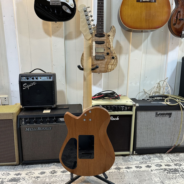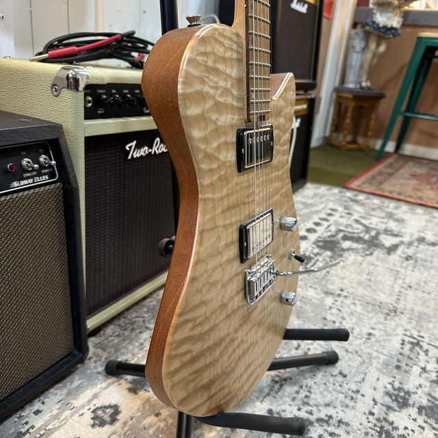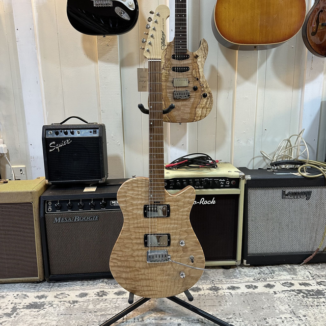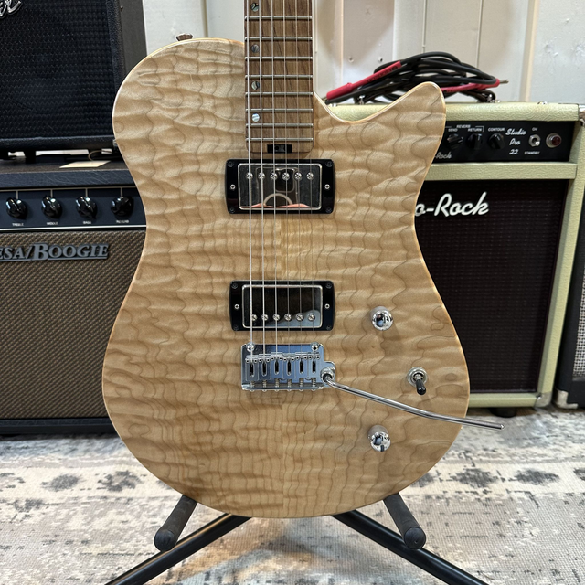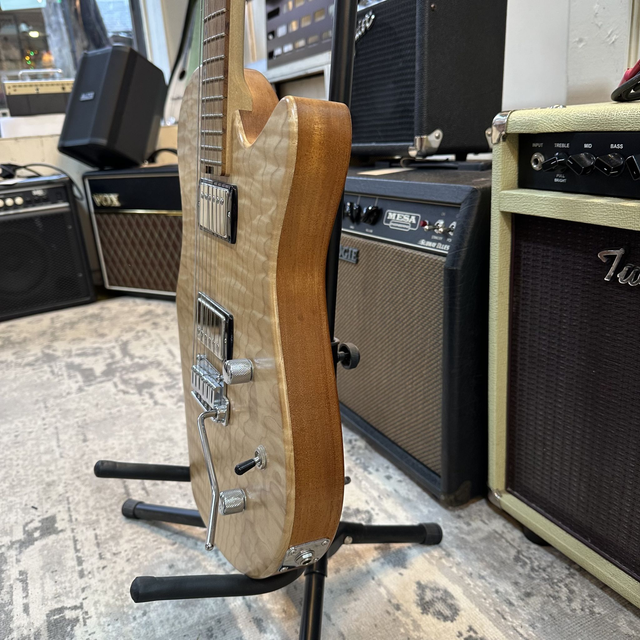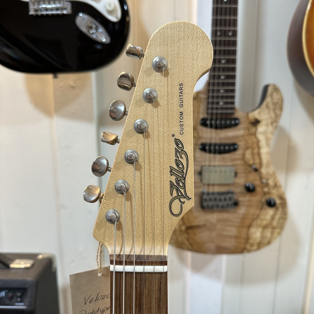 Prototype hand-built Velozo guitar. Mahogany body, quilted maple top, maple neck, rosewood fingerboard, GOTOH tremolo and GOTOH locking tuners.
