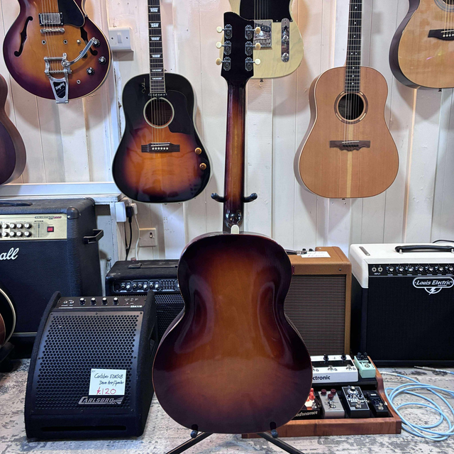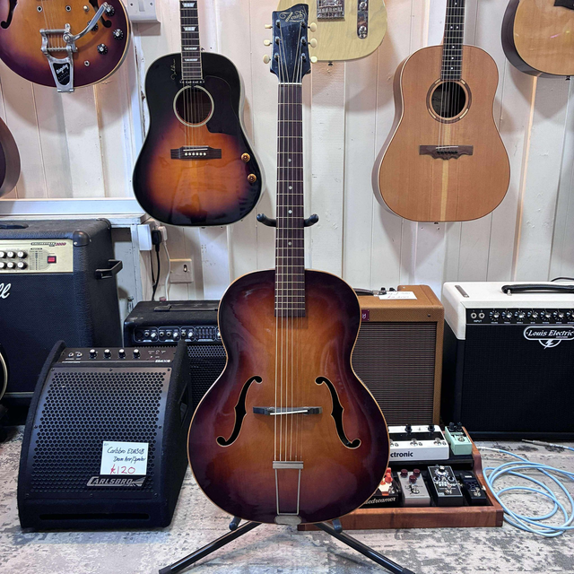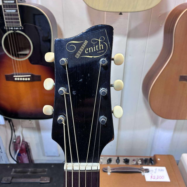 The Zenith Jazz Guitar Model 17 with Piezo (circa 1955) is a rare vintage archtop that embodies the rich heritage of mid-century jazz craftsmanship. Built during an era when hand-carved tonewoods and elegant design defined the standard, the Model 17 features a full-size archtop body with a carved spruce top and maple back and sides, producing a warm, resonant acoustic voice with exceptional projection and clarity. Its comfortable neck and smooth ebony fingerboard make it ideal for both chordal comping and melodic solo work. The later addition of a piezo pickup expands its versatility, allowing the guitar’s natural acoustic tone to be amplified with remarkable transparency. With its classic f-holes, vintage sunburst finish, and aged patina, the 1955 Zenith Model 17 exudes character and history — a true collector’s piece that captures the soulful sound and timeless aesthetic of the golden age of jazz guitars.